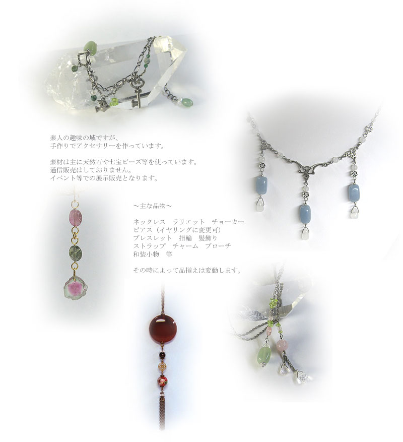ネックレス,、ピアス、ブレスレット、ストラップや和装小物等の手作りアクセサリーを